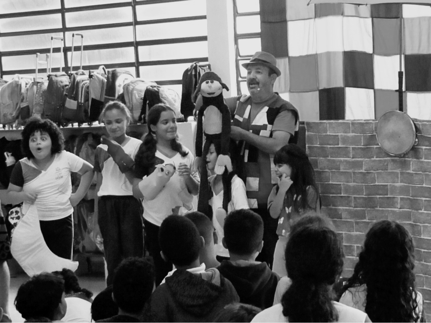 Noutra escola, abrimos o “Saco de Bichos” — que não é um saco comum, não se engane. É um saco encantado, que guarda criaturas birrentas, ranzinzas, saltitantes e muito engraçadas, cada uma revelando um pedacinho das emoções que a gente sente, mas nem sempre sabe nomear. E assim, entre risadas e espantos, conversamos sobre sentimentos e aprendemos a brincar com eles também.