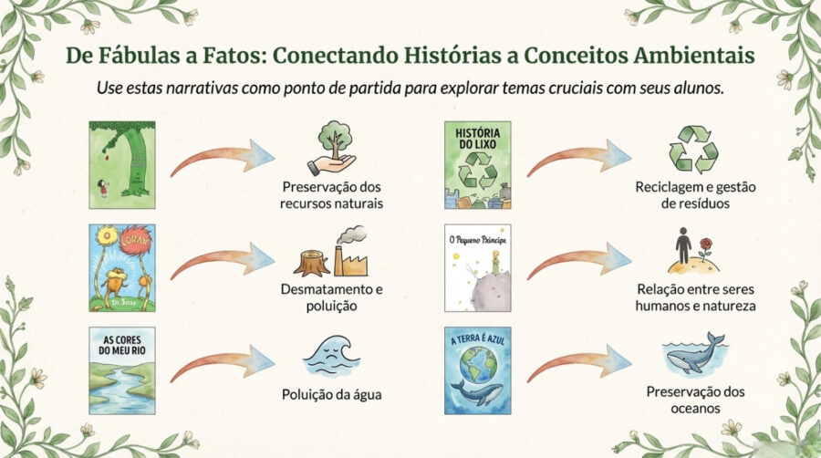 A seguir, uma breve correlação dos conceitos a serem abordados em cada livro. As atividades podem ser baseadas nos temas abordados em cada livro e história para criar jogos, brincadeiras e contação de histórias sobre o meio ambiente.