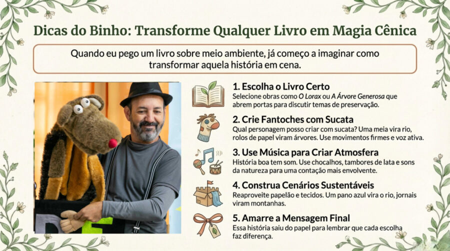 “Quando eu pego um livro sobre meio ambiente, já começo a imaginar como transformar aquela história em cena.” Obras como O Lorax, As Cores do Meu Rio e A Árvore Generosa abrem portas para discutir preservação, poluição e cuidado com a natureza. Escolher o título certo facilita a criação da narrativa cênica e o envolvimento das crianças.