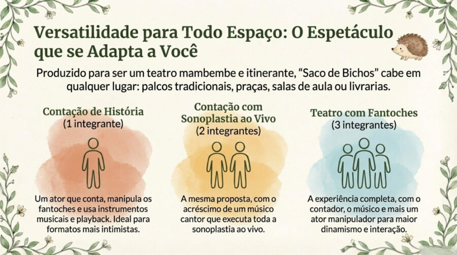 Eu sempre digo: “História boa tem som.” Chocalhos com sementes, tambores feitos de latas e reco-recos artesanais ajudam a marcar o movimento do vento, da água ou dos animais. Esses sons conectam a narrativa ao universo natural descrito no livro e deixam a contação mais envolvente.